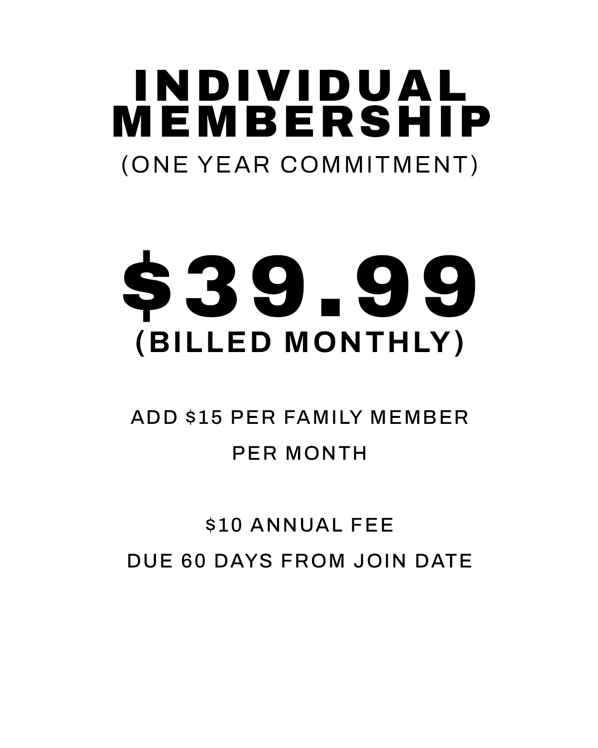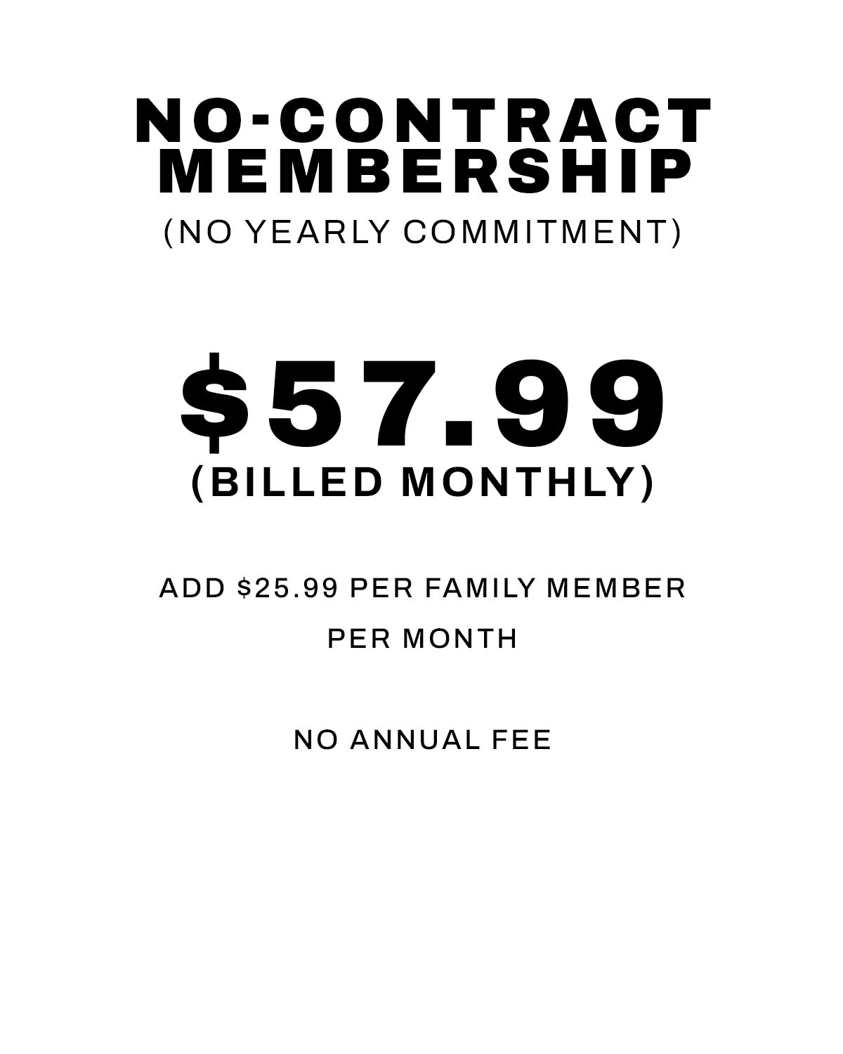 Please Visit the Gym during staffed hours for a Day Pass, to add a family member or to sign up for our other packages that may best fit your needs.